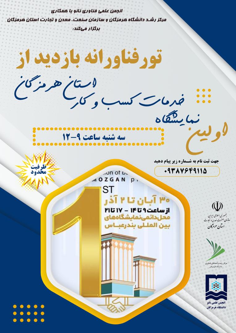 این تور فناورانه با محوریت بازدید از اولین نمایشگاه خدمات کسب و کار استان هرمزگان توسط انجمن علمی فناوری نانو با همکاری مرکز رشد دانشگاه هرمزگان و سازمان صنعت، معدن و تجارت استان هرمزگان از تاریخ 30 آبان تا 2 آذر ماه از ساعات 9-14 و 17-21 در محل دائمی نمایشگاه های بین المللی بندرعباس برگزار خواهد شد.