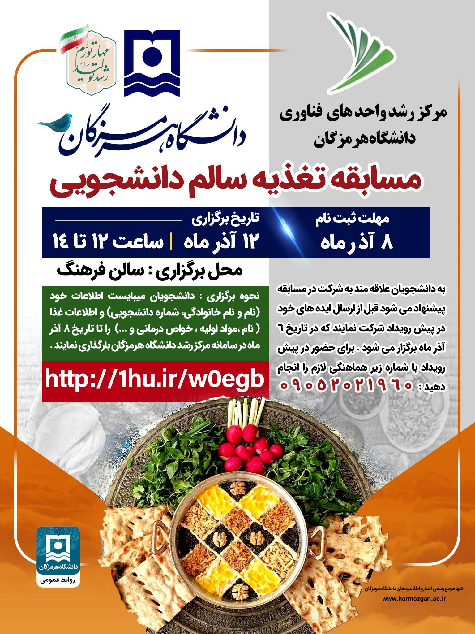 مسابقه تغذیه سالم دانشجویی در تاریخ 12 آذرماه، ساعت 12-14 در محل سالن فرهنگ دانشگاه هرمزگان برگزار خواهد شد.
