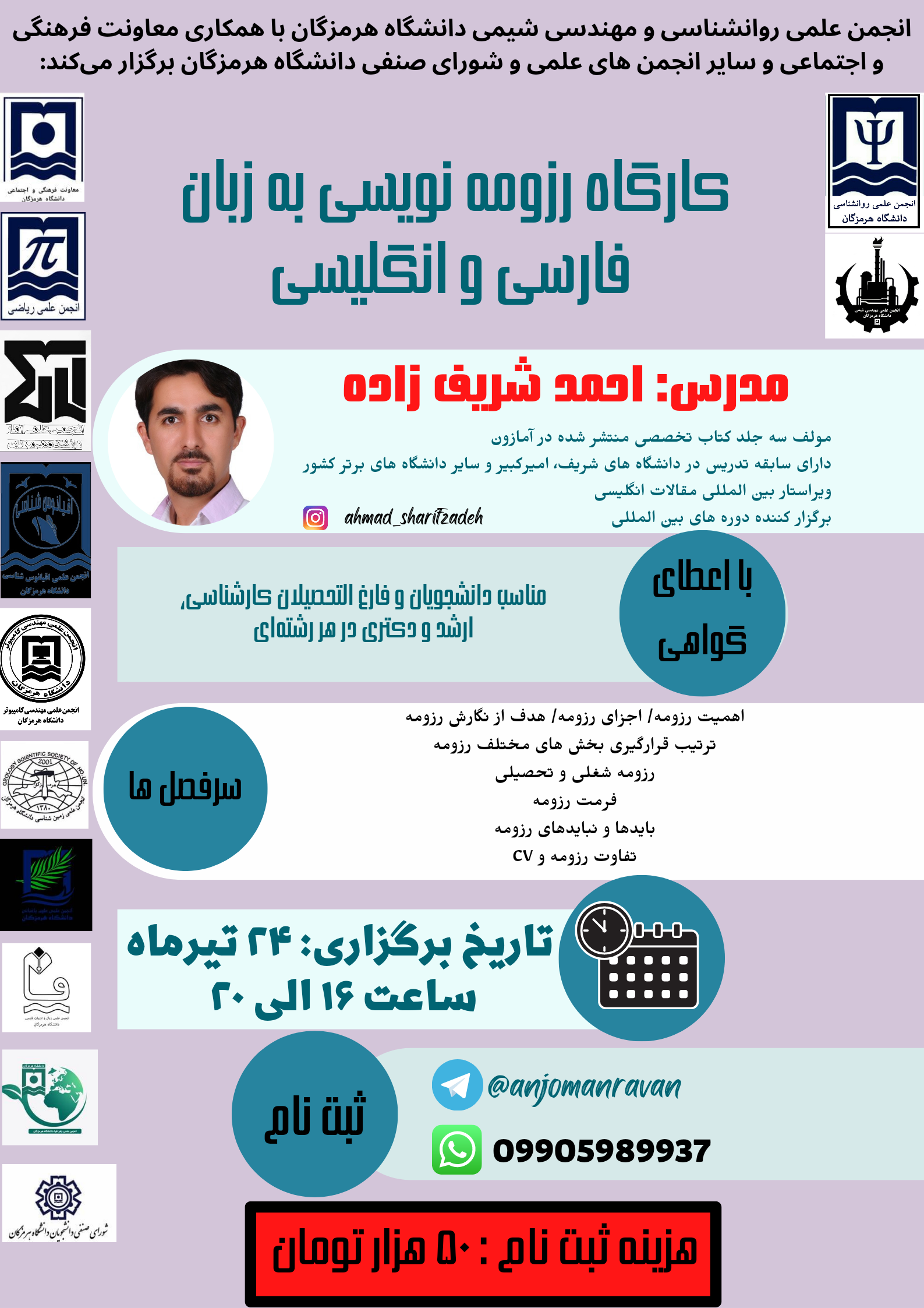 انجمن علمی روانشناسی دانشگاه هرمزگان با همکاری معاونت فرهنگی و اجتماعی و سایر انجمن‌ها برگزار می‌کند:دوره جامع پایان‌نامه نویسی