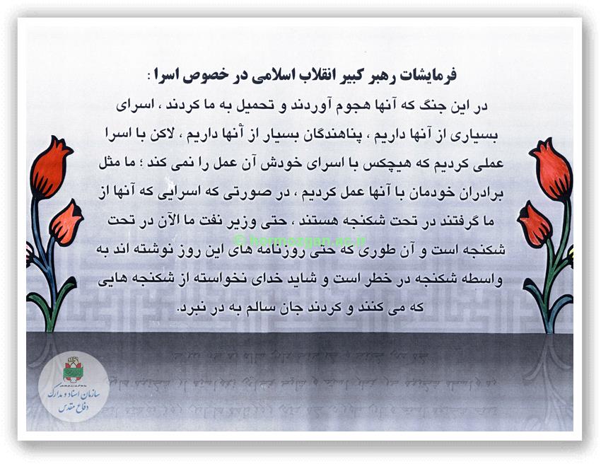 مسأله اسارت طولانى فرزندان این ملت به‏ نوبه خود امتحان دیگرى بود که ملت ما با موفقیت آن‏را به انجام رسانده و اسراى ما همانند ملت ایران، از خود آزادمردى نشان دادند و سرانجام با موفقیت و سرافرازى به وطن بازگشتند .... شما در دوران اسارت، شرایط سختى را گذراندید، اما در عین حال با حفظ دین و اعتقادات و دلبستگى خود به اسلام، امام و انقلاب، موجب افتخار و آبرومندى ملت خود در برابردشمن شدید.»