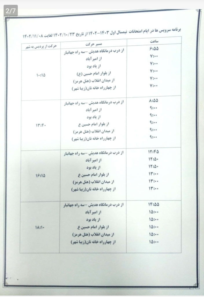ساعات حرکت سرویس ها در ایام امتحانات پایان ترم