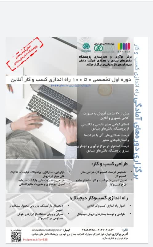 مرکز نوآوری و تجارت سازی پژوهشگاه دانش های بنیادی با همکاری شرکت دانش بنیان ایده پردازان بانی بر برگزار می کند.