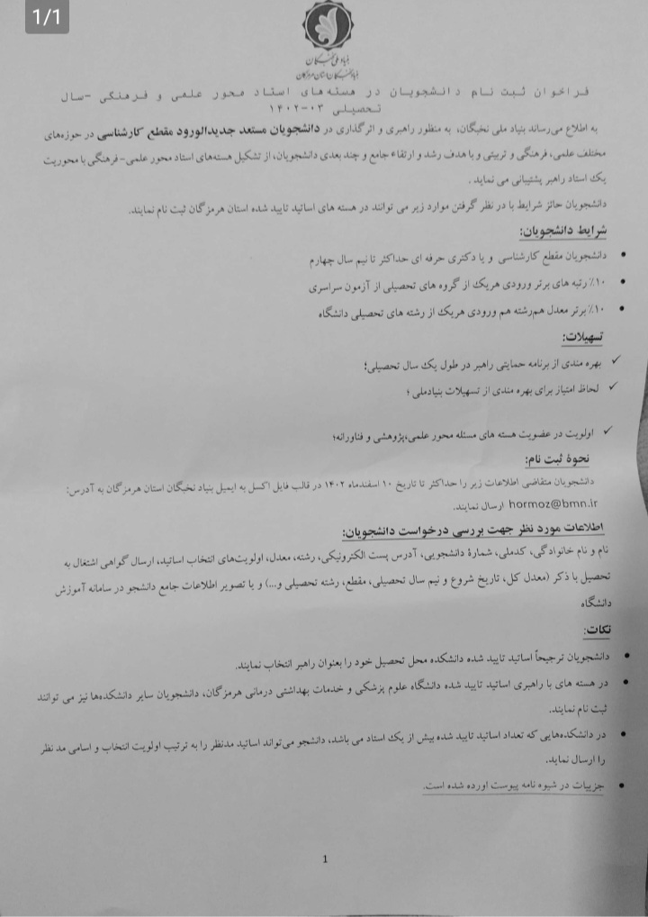 فراخوان ثبت نام دانشجویان در هسته های استاد محور علمی و فرهنگی