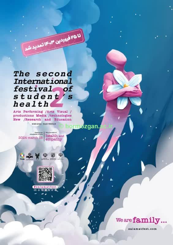 برگزاري دومين جشنواره بين المللي سلامت دانشجويان مهلت ارسال آثار تا ٢٥ فروردين ١٤٠٣ تمديد شد. دومين جشنواره بين المللي سلامت دانشجويان با موضوع سلامت و همدلي و شعار "ما يك خانواده ايم و هم سرنوشتيم "درحال برگزاري است. تمركز اين جشنواره بر روي قشر جوان دانشجو است و قصد دارد تا با در نظرگيري معضلات و مسائل دانشجويي استعدادها و علايق دانشجو را پيدا كند. جهت ارسال آثار خود به سایت www.salamatfest.com  مراجعه نمایید.