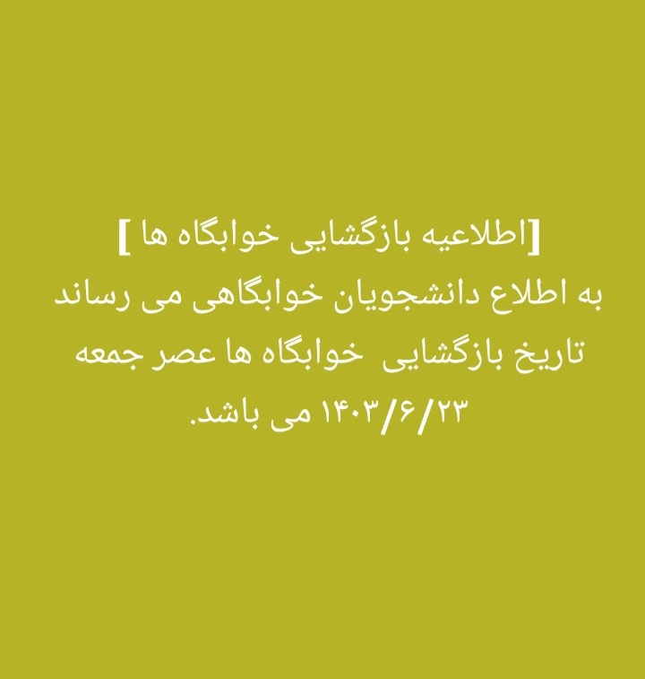 قابل توجه کلیه دانشجویان خوابگاهی. تاریخ بازگشایی خوابگاه ها عصر جمعه 23 شهریورماه می باشد