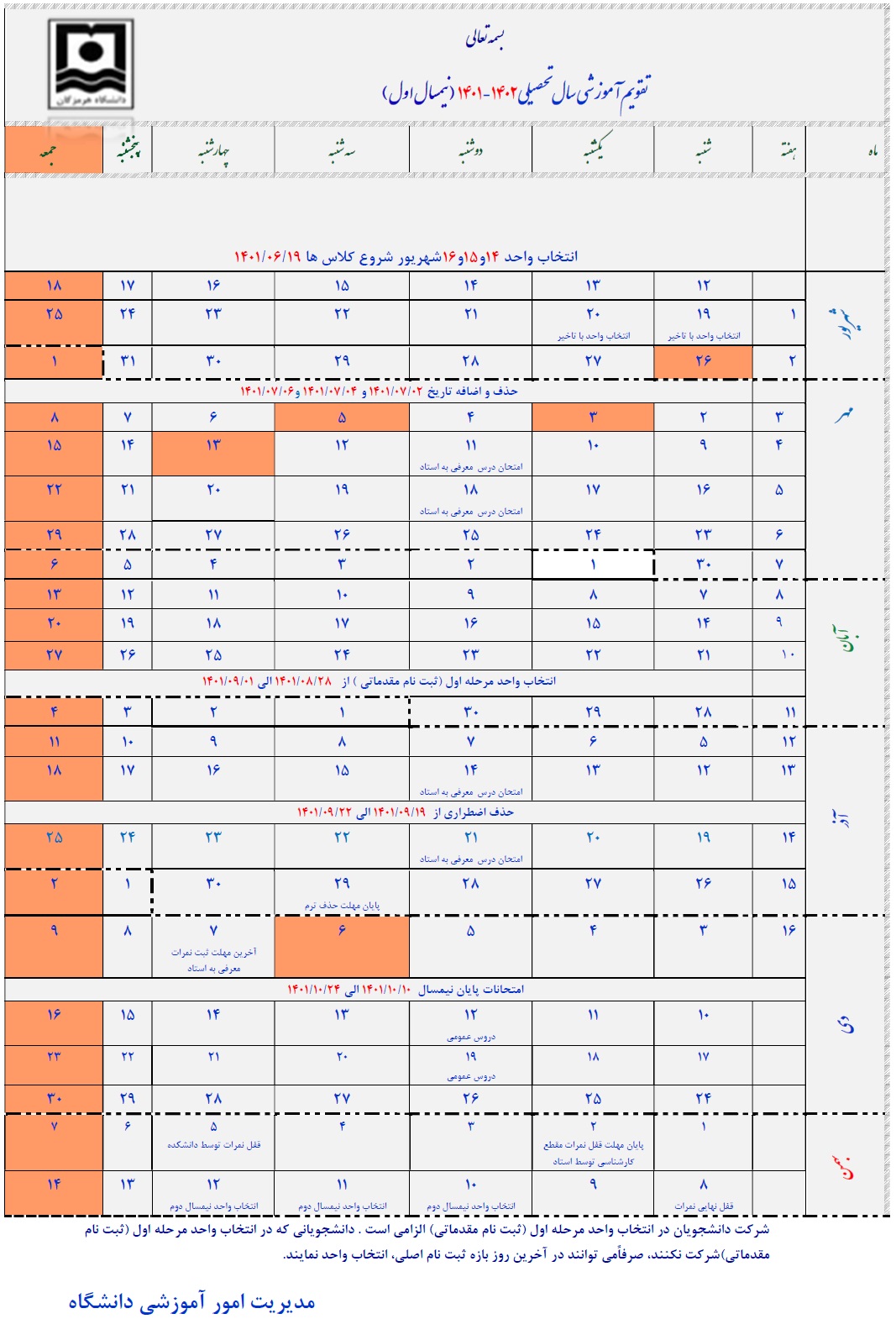 تقویم آموزشی نیمسال اول 1402 - 1401