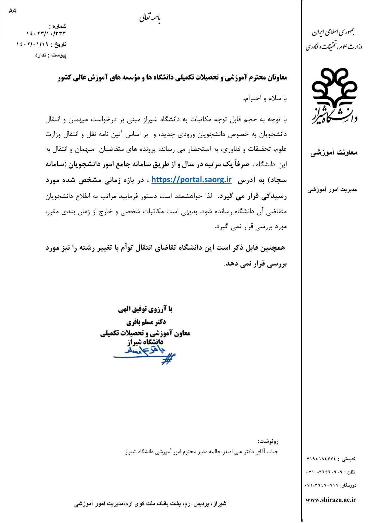 قابل توجه دانشجویان کارشناسی ( ثبت درخواست مهمانی یا انتقالی در دانشگاههای شیراز، قوچان ، سمنان)