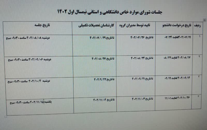 تاریخهای برگزاری جلسات شورای موارد خاص دانشگاهی و استانی نیمسال اول 1402