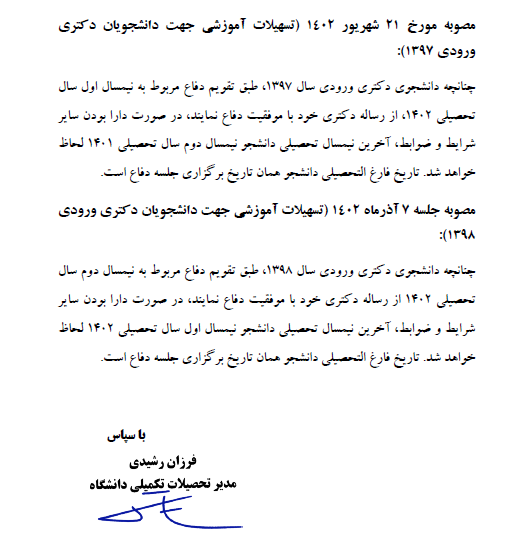 مصوبه شورای آموزشی دانشگاه در خصوص ترم دفاع از پایان نامه و رساله دانشجویان دکتری ورودی 97 و 98
