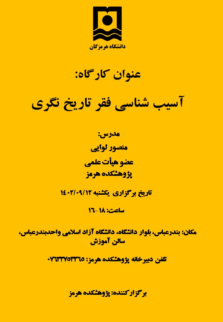 کارگاه آموزشی آسیب شناسی فقر تاریخ نگری روز یکشنبه مورخ 12 آذر 1402 در سالن آموزش دانشگاه آزاد اسلامی واحد بندرعباس ساعت 18-16 برگزار می‌گردد.