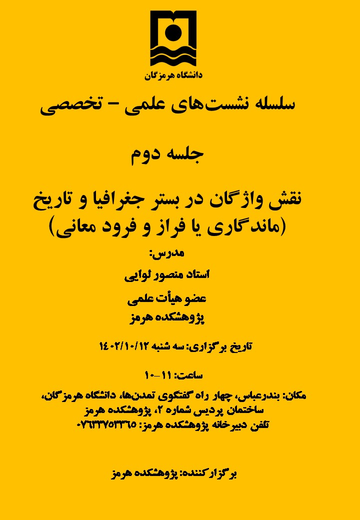 جلسه دوم سلسله نشست‌های علمی - تخصصی "نقش واژگان در بستر جغرافیا و تاریخ (ماندگاری یا فراز و فرود معانی)" روز سه شنبه مورخ 12 دی 1402 در پژوهشکده هرمز دانشگاه هرمزگان برگزار می‌گردد.
