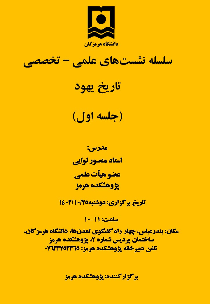 جلسه سوم سلسله نشست‌های علمی - تخصصی روز دوشنبه مورخ 25 دی 1402 در پژوهشکده هرمز دانشگاه هرمزگان با موضوع تاریخ یهود (جلسه اول) برگزار می‌گردد.