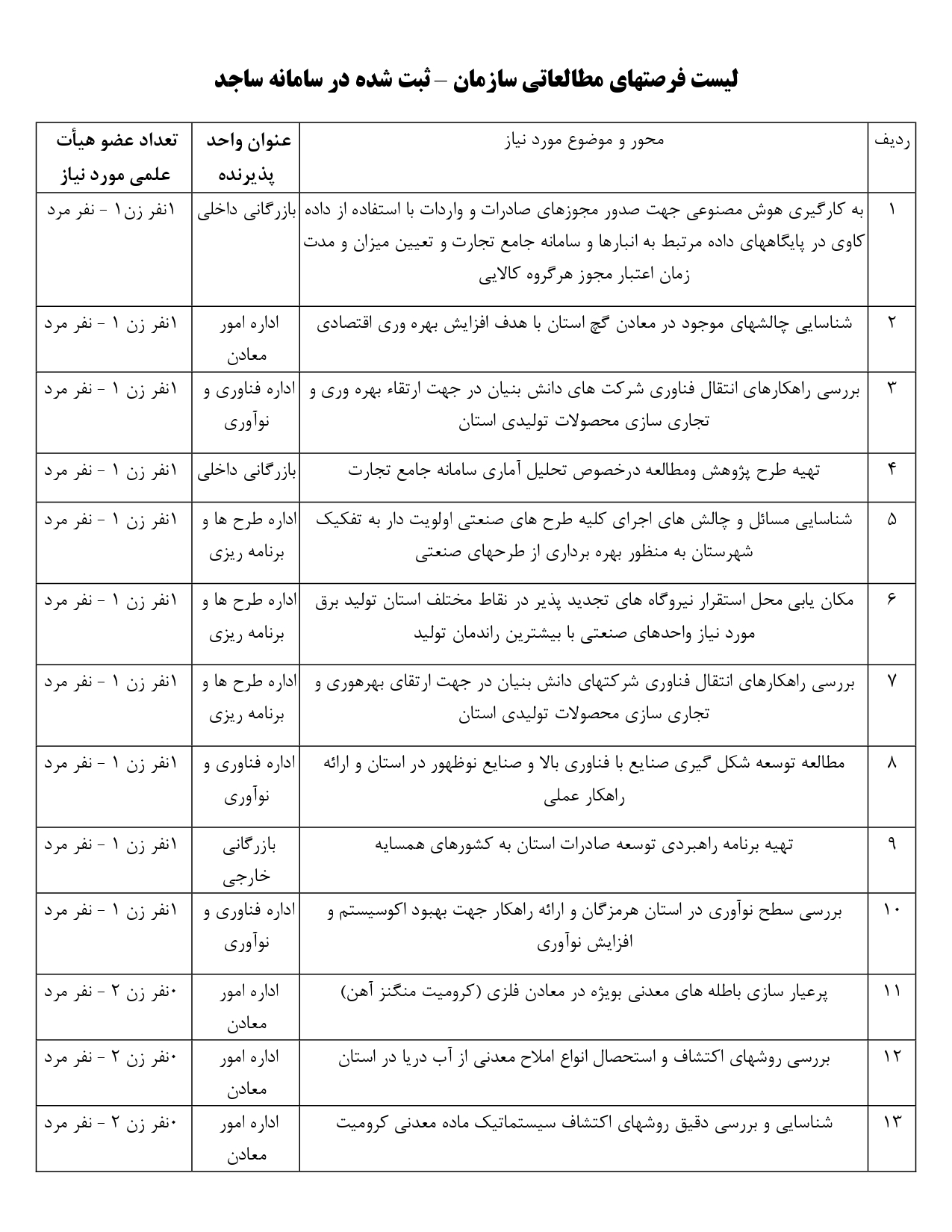 عطف به موافقت نامه همکاری فی مابین وزارت صمت و وزارت عتف و اختصاص سهمیه در قالب فرصت های مطالعاتی اعضای محترم هیات علمی دانشگاه ها برای دفاتر ستادی و ادارات کل استانی وزارت صنعت، معدن و تجارت عناوین فرصت های مطالعاتی مورد نظر سازمان مذکور که در سامانه ساجد نیز ثبت گردیده قابل بهره برداری می باشد.