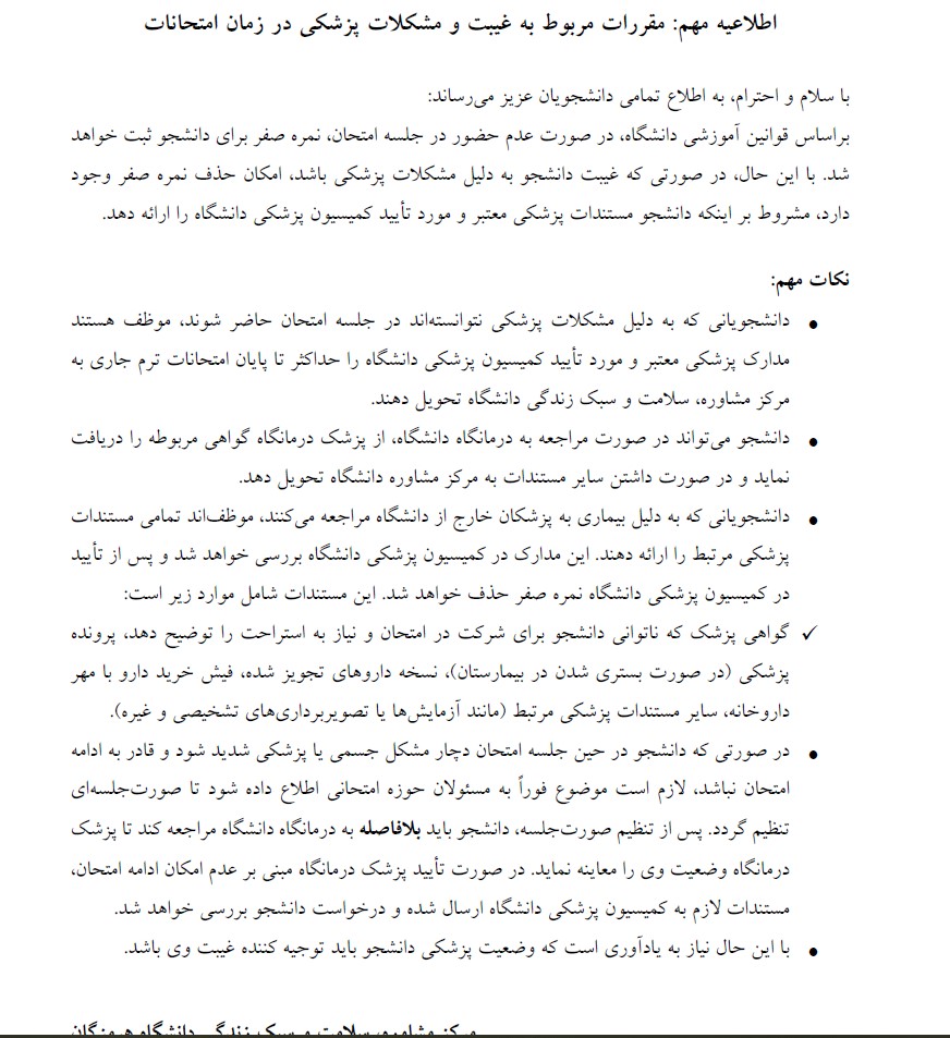 اطلاعیه تحویل مدارک پزشکی غیبت در امتحانات