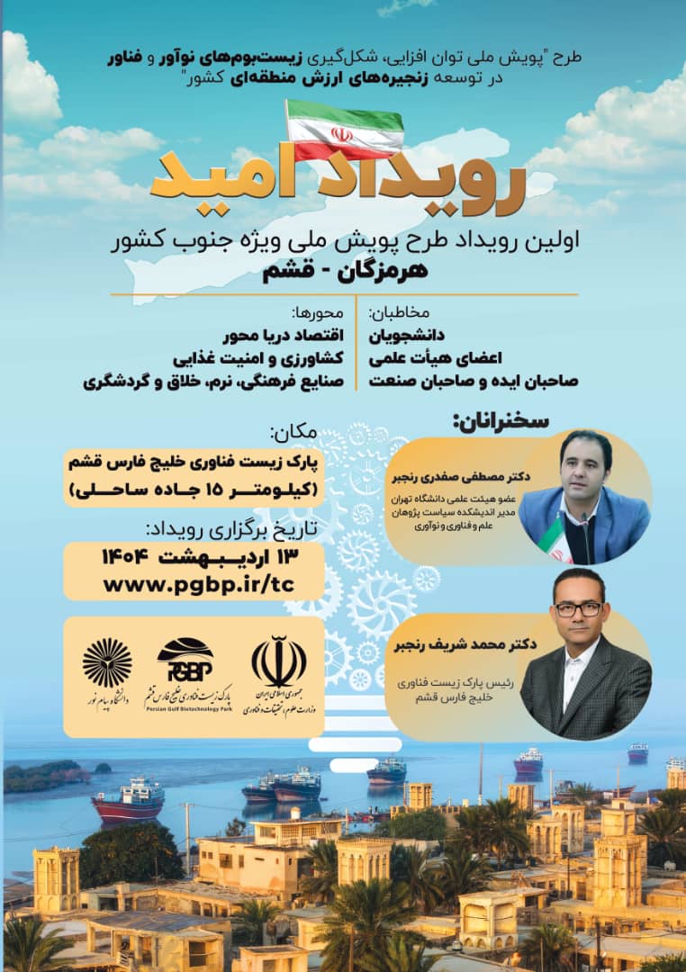 پارک زیست فناوری خلیج فارس قشم با همکاری وزارت علوم، تحقیقات و فناوری برگزار می نماید. 🔶️ رویداد امید "اولین رویداد طرح پویش ملی ویژه جنوب کشور هرمزگان _ قشم 📆 زمان برگزاری رویداد 1404/02/13 ⏱ ساعت 8:00 الی 12:00 📌 پارک زیست فناوری خلیج فارس قشم www.pgbp.ir/tc 💢 با ما همراه باشید https://chat.whatsapp.com/JPpz2MgCUx24cVnEXgKlWt https://eitaa.com/Qeshmpgbp