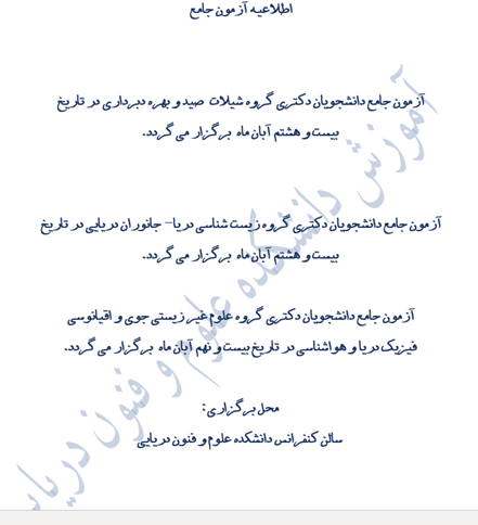 آزمون جامع دانشجویان مقطع دکتری در روزهای بیست و هشتم و بیست و نهم آبان ماه در سالن کنفرانس دانشکده علوم و فنون دریایی برگزار می گردد
