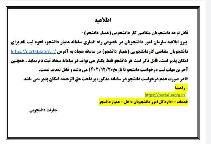 دانشجویان متقاضی کار دانشجویی جهت ثبت نام در سامانه همیار دانشجو تا تاریخ 1402/12/20 اقدام نمایند.