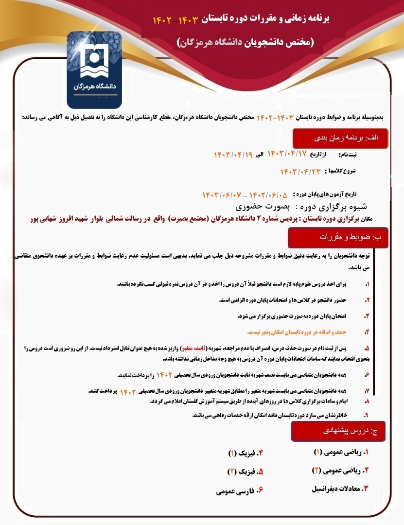 برنامه زمانی و مقررات دوره تابستان 1403-1402 (مختص دانشجویان دانشگاه هرمزگان)