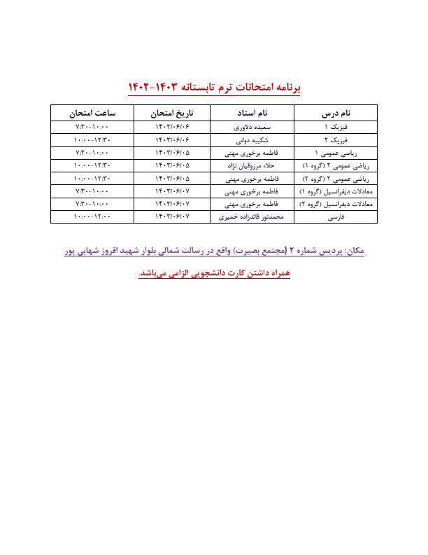 برنامه امتحانات ترم تابستانه 1403-1402