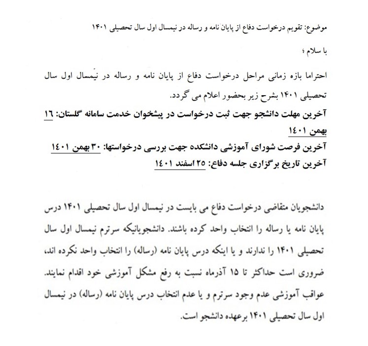 بازه زمانی درخواست دفاع از پایان نامه و رساله دکتری در نیمسال اول 1401