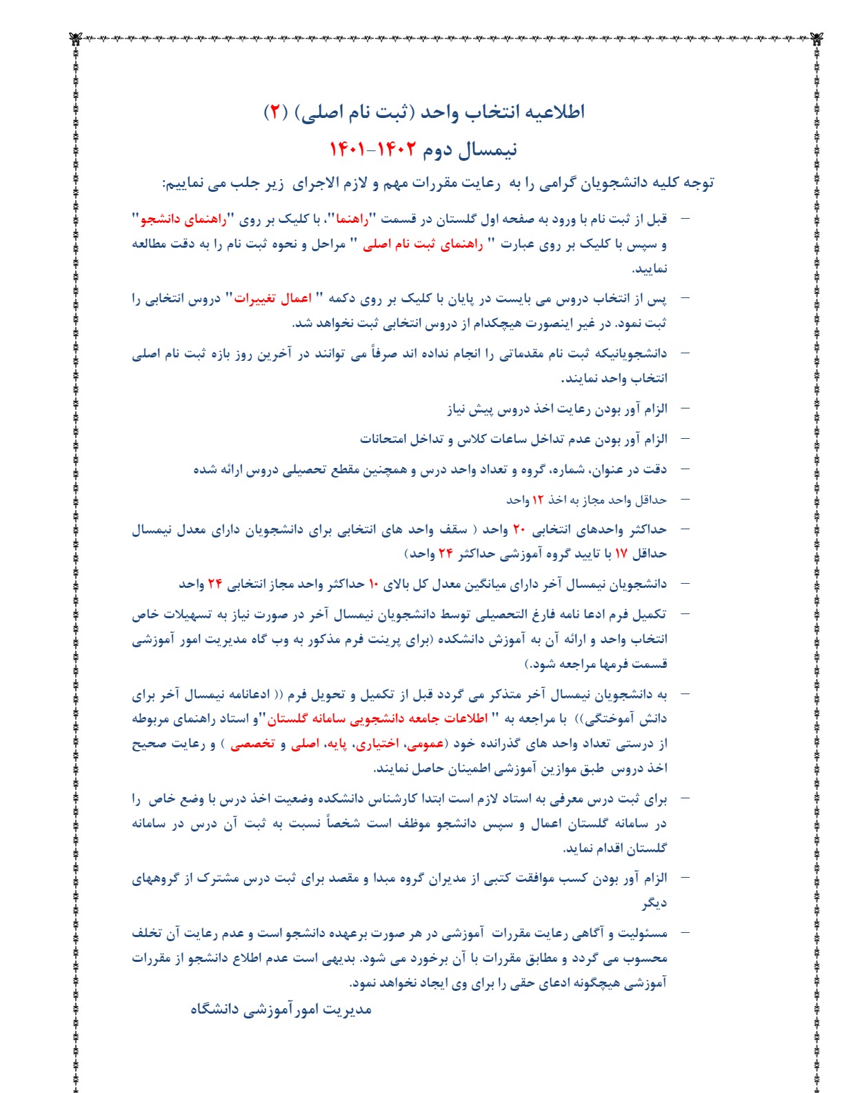 اطلاعیه انتخاب واحد(ثبت نام اصلی) نیمسال دوم 1402-1401