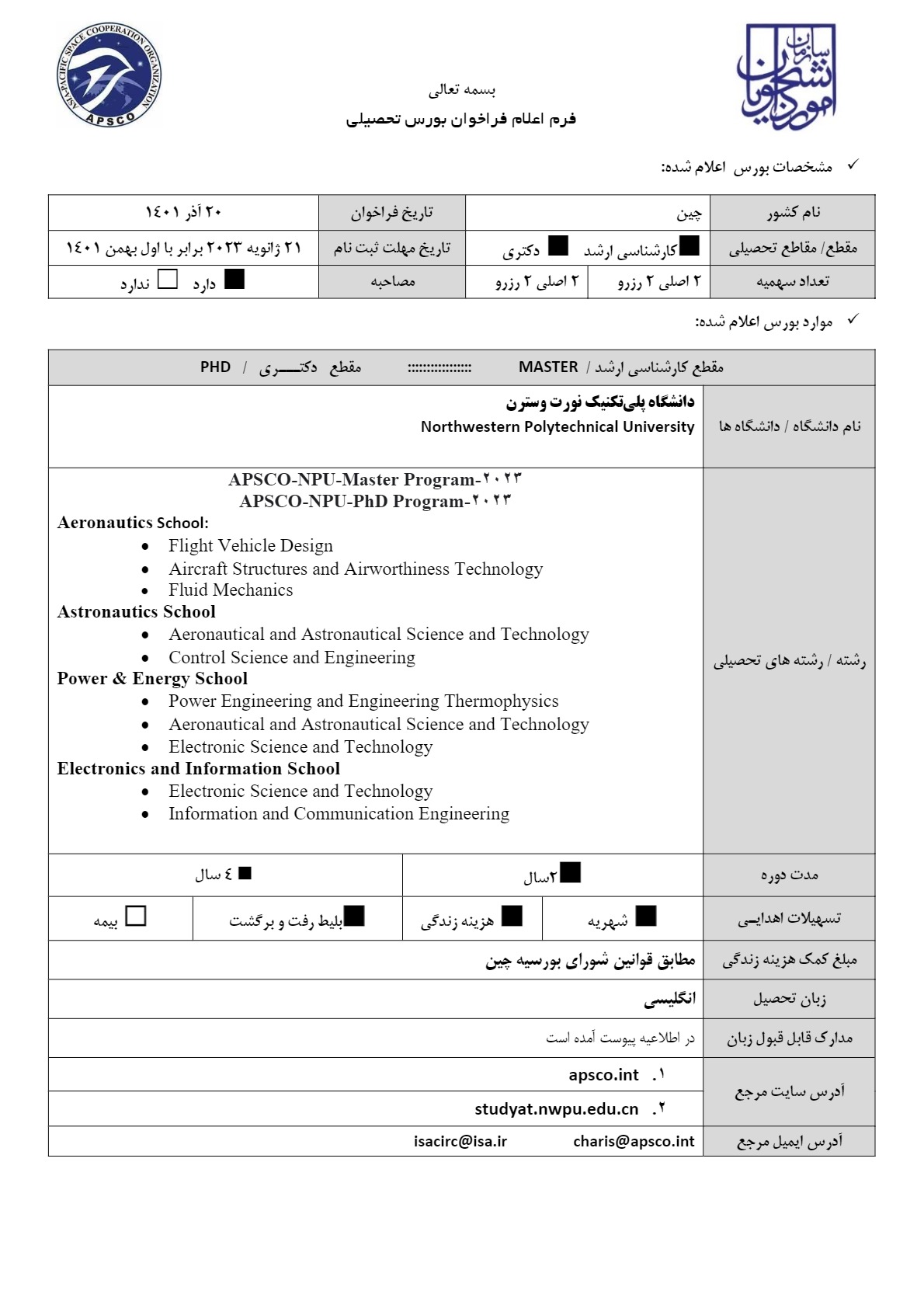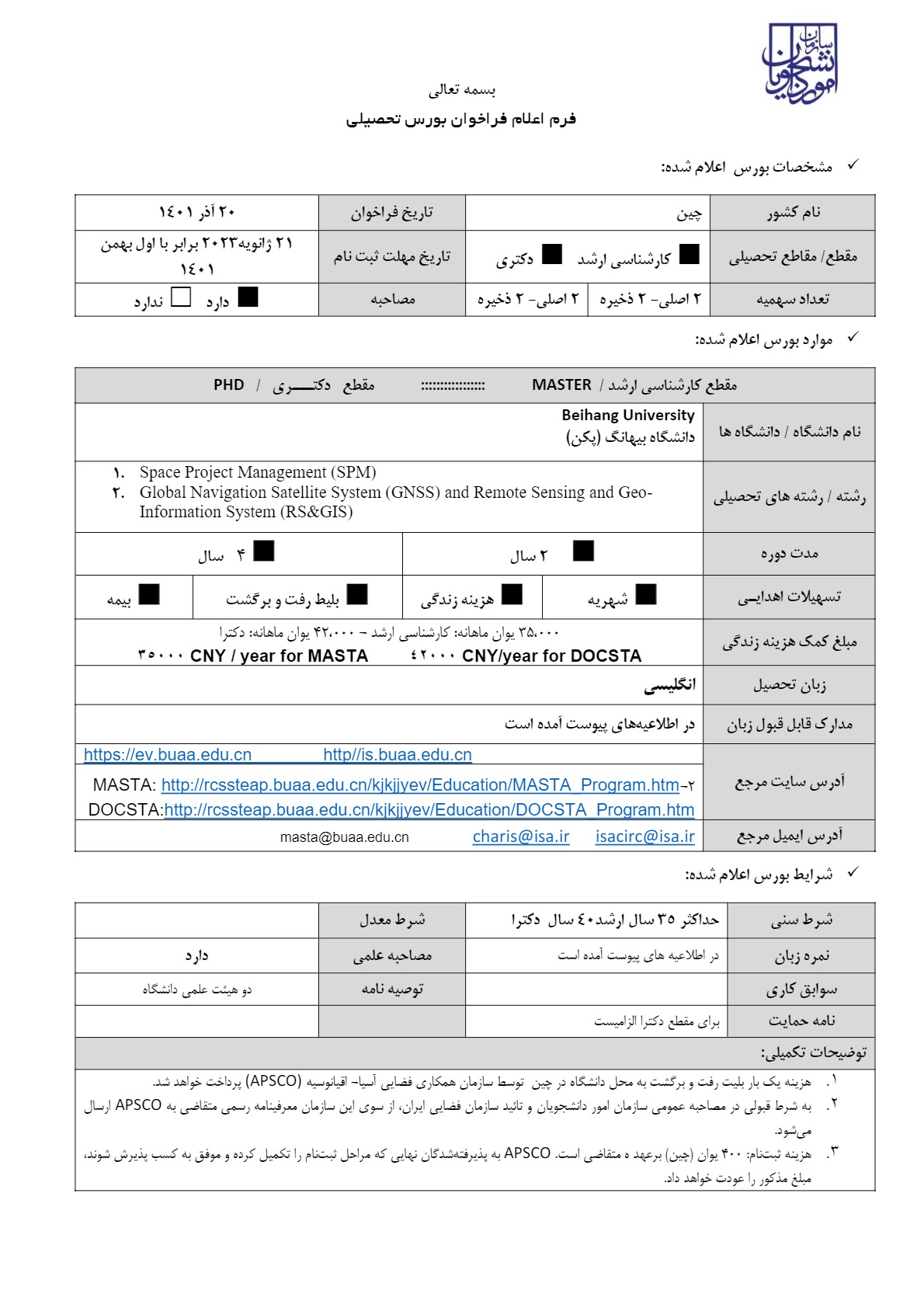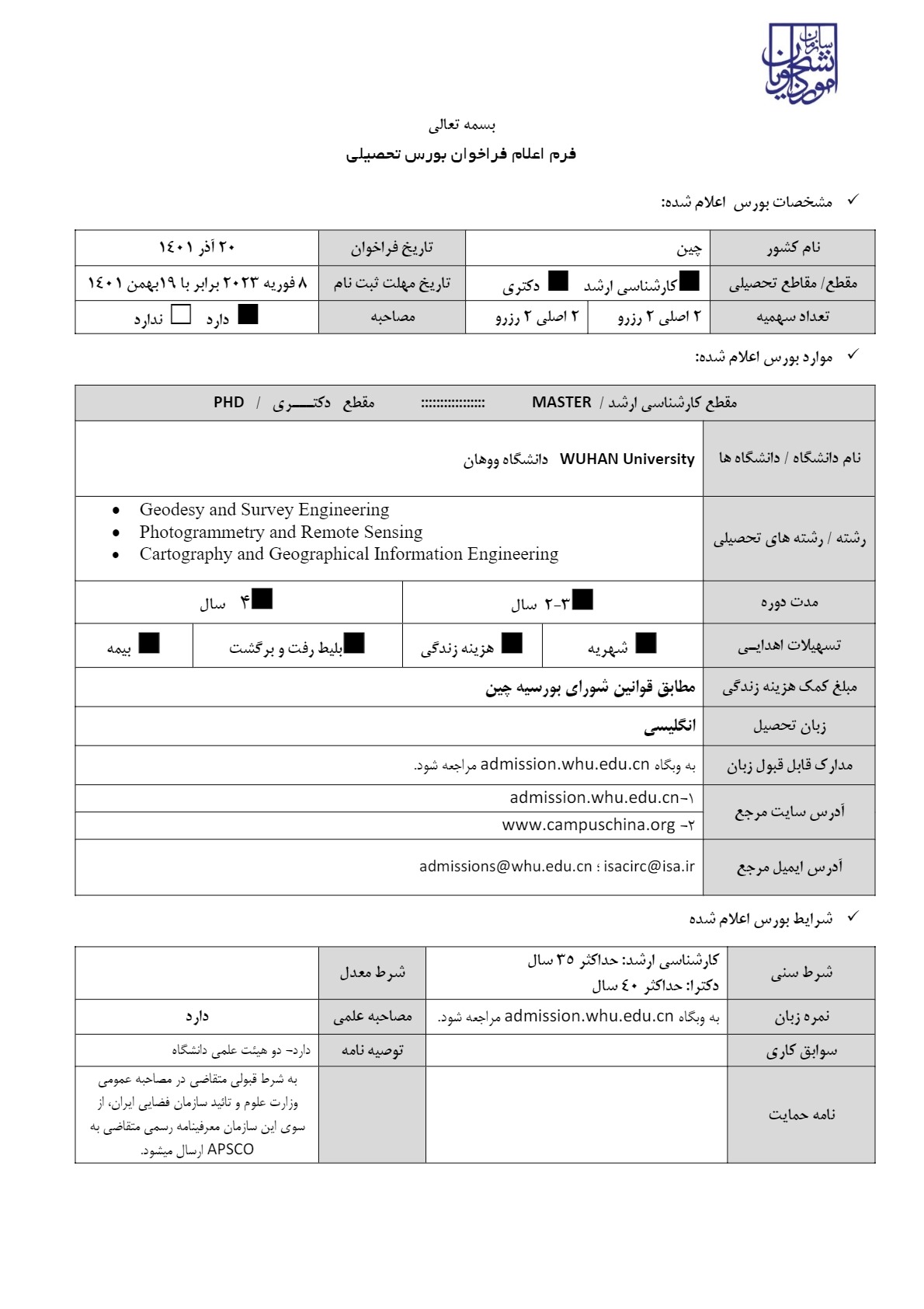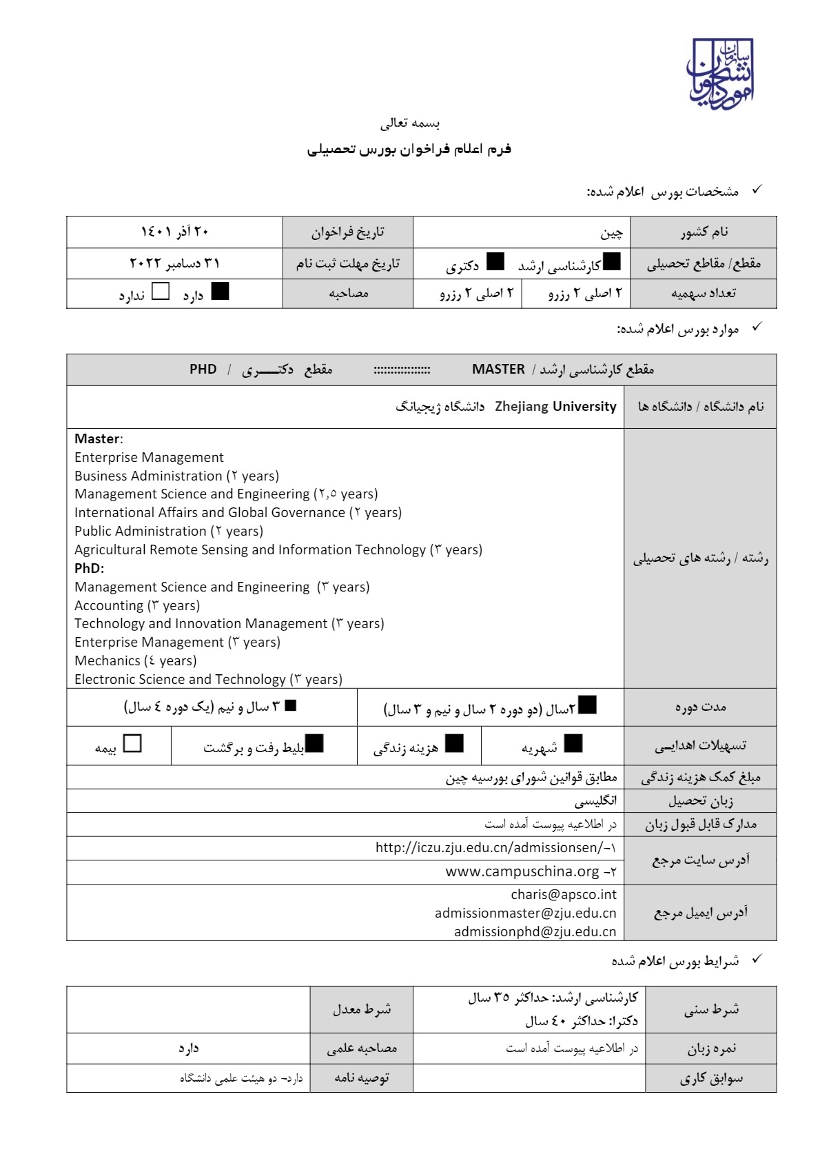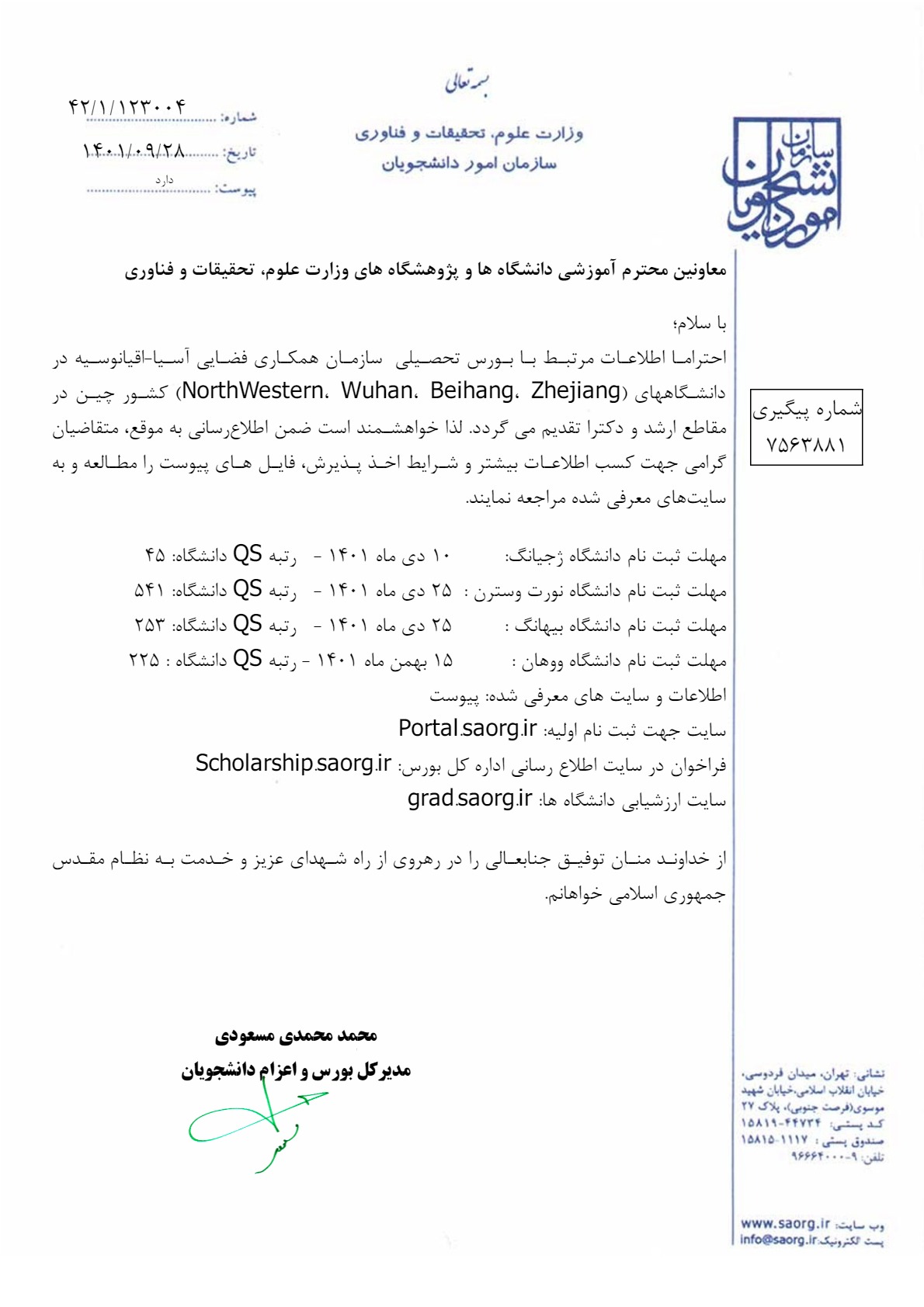 بورسیه تحصیلی وزارت علوم، تحقیقات و فناوری کشور چین