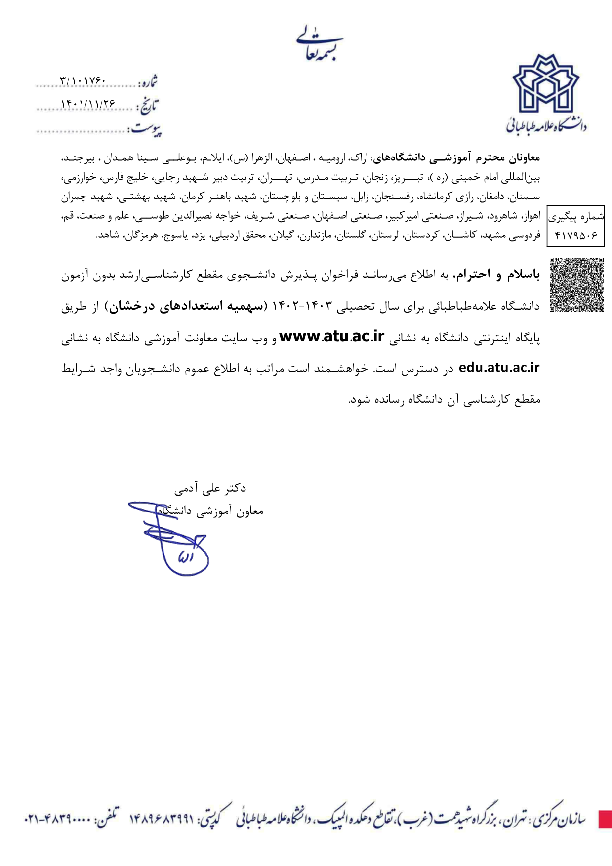 فراخوان پذیرش دانشجو به شیوه بدون آزمون در (استعداد درخشان) برای سال تحصیلی4031-1402دانشگاه علامه طباطبایی