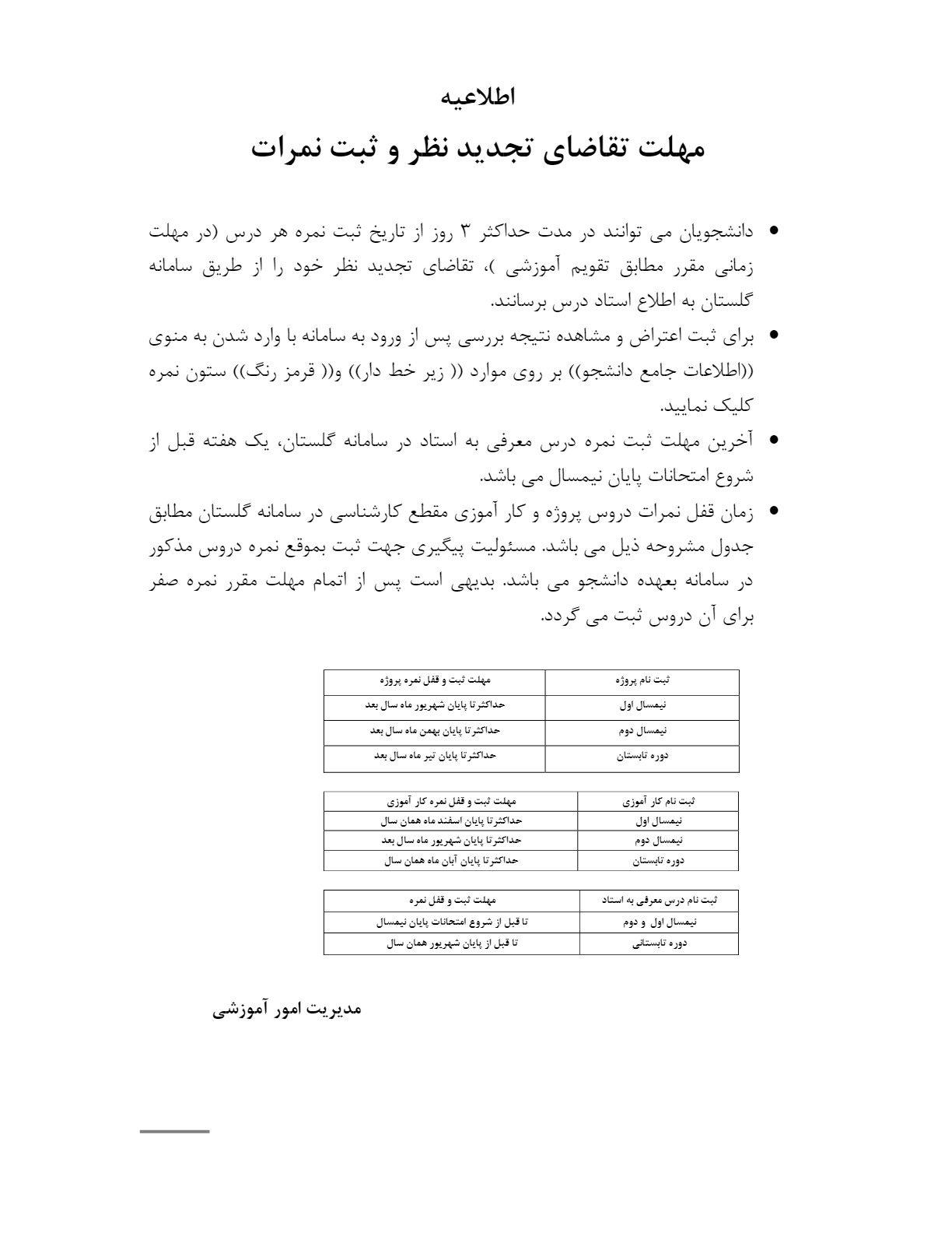 اطلاعیه مهلت تقاضای تجدید نظر و ثبت نمرات