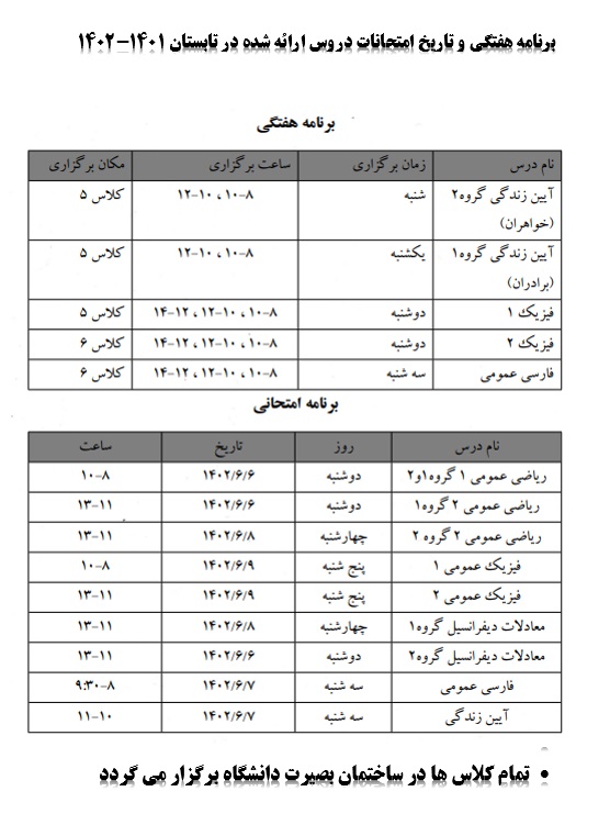 برنامه هفتگی و امتحانات دروس ارائه شده در تابستان 1401-1402