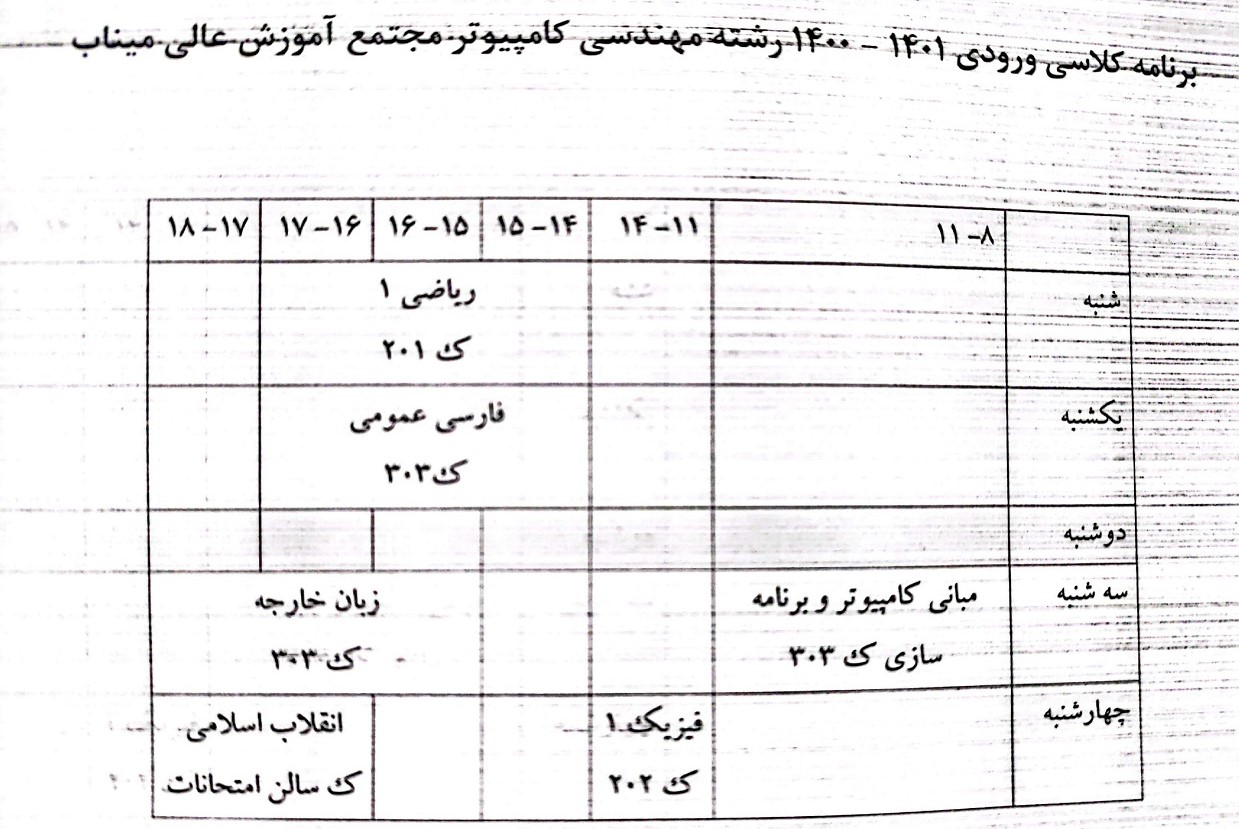 ضمن تبریک به مناسبت ورود شما دانشجوی گرامی به دانشگاه هرمزگان مجتمع آموزش عالی میناب، به اطلاع می رساند برنامه ی هفتگی رشته های مختلف به شرح جداول زیر می باشد.