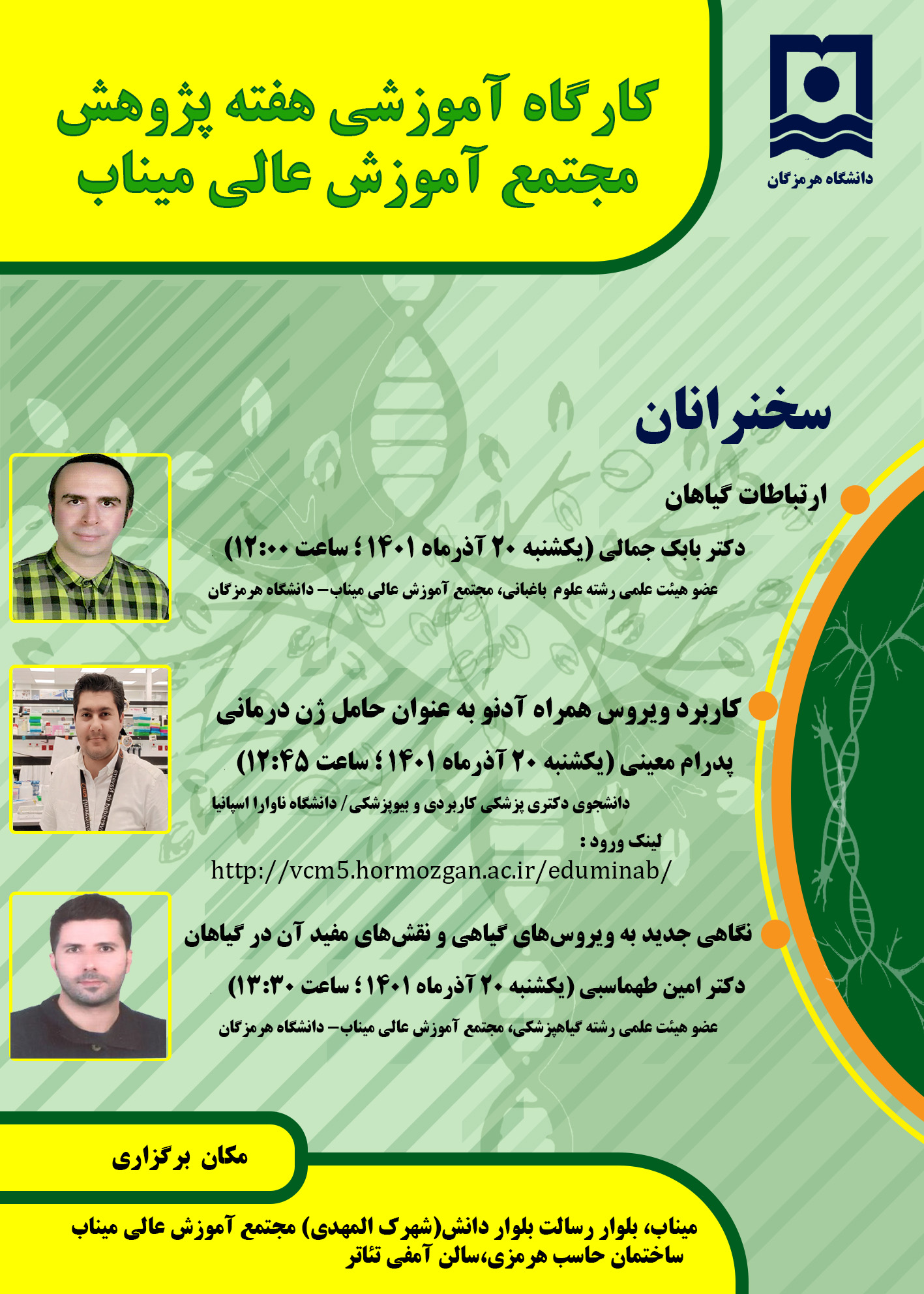 معاونت آموزش و پژوهش مجتمع آموزش عالی میناب به مناسبت هفته پژوهش اقدام به برگزاری کارگاه های آموزشی با موضوعات زیر می نماید. ضمنا امکان شرکت در کارگاه های فوق بصورت مجازی نیز مهیا می باشد. جهت این منظور از لینک زیر استفاده نمایید: