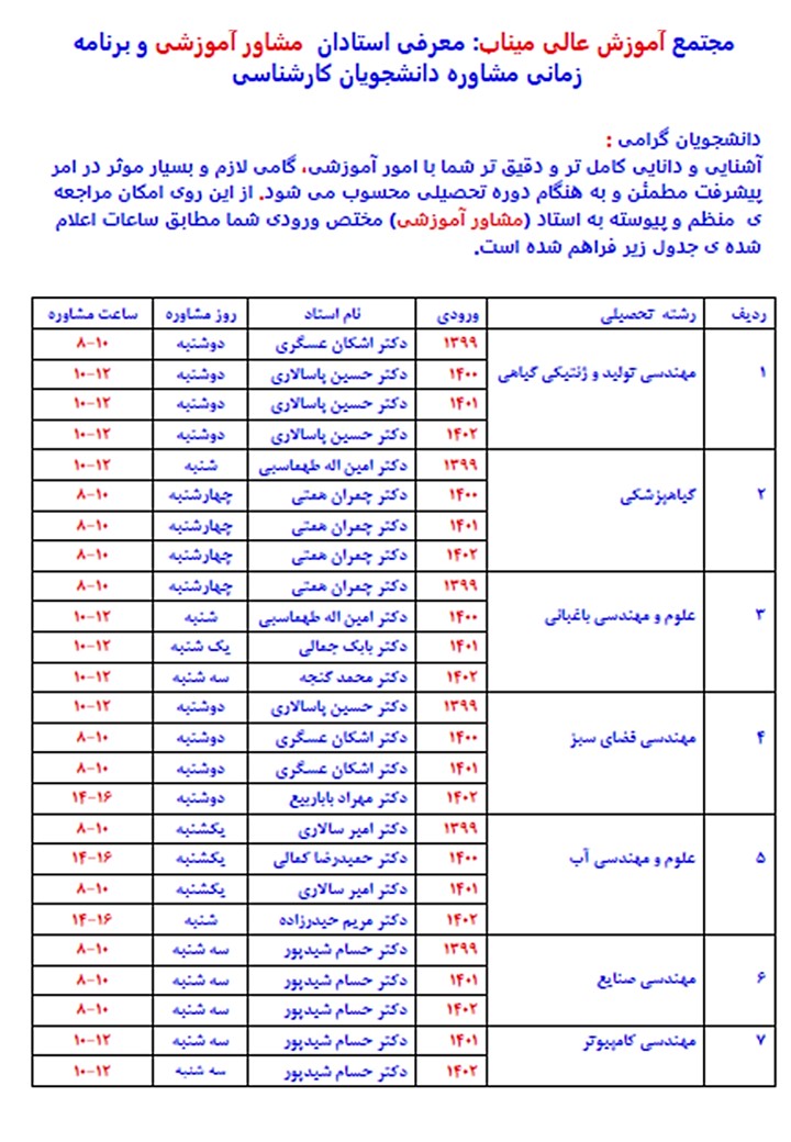 در جهت سهولت دسترسی دانشجویان گرامی به مشاوره ی آموزشی، برنامه ی مراجعه به استاد مشاور هر ورودی مطابق جدول زیر مشخص شده است: