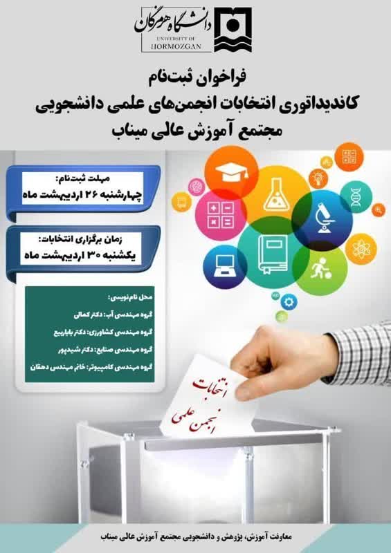 انتخابات انجمن های علمی مجتمع آموزش عالی میناب با مشارکت دانشجویان در تاریخ یکشنبه 30 اردیبهشت ماه برگزار گردید که نتایج آراء بدست آمده به شرح زیر است.